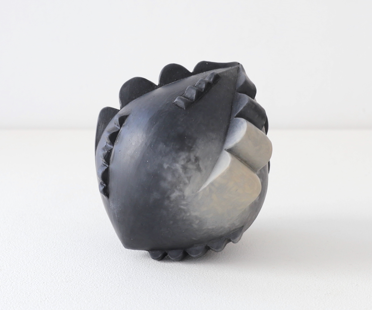 成形後、生乾きの状態で表面を石や金属、木のヘラなどを使って光沢が出るまで磨き締め、低めの温度で炭化焼成(生地に炭素を吸着させる焼き方)をし、黒い艶のある土器に焼き上げています。